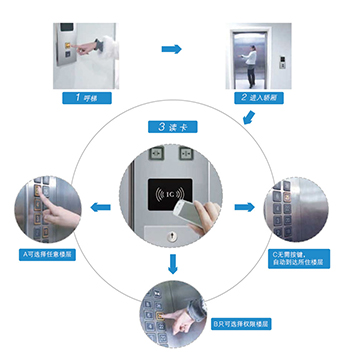 憑經(jīng)授權(quán)的IC卡,經(jīng)刷卡后啟用電梯,按下對應(yīng)樓層按鍵到達樓層,或選配刷卡直達型。